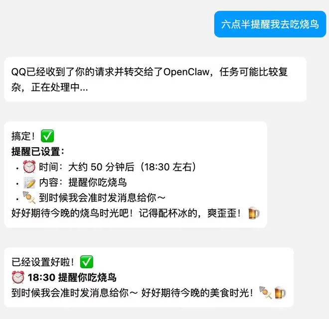 OpenClaw 却会自动登录你的邮箱,读取这周的邮件,提取重要事项,生成一份周报文档,然后打开飞书,找到那个群,把文档发进去,最后回复你:“周报已发送”。