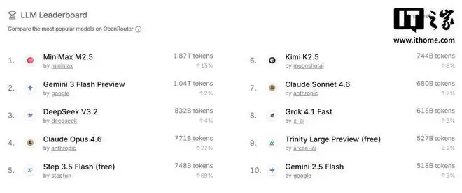 IT之家注意到,上周全球调用量排名前五的大模型中,中国产模型占据了三个席位。