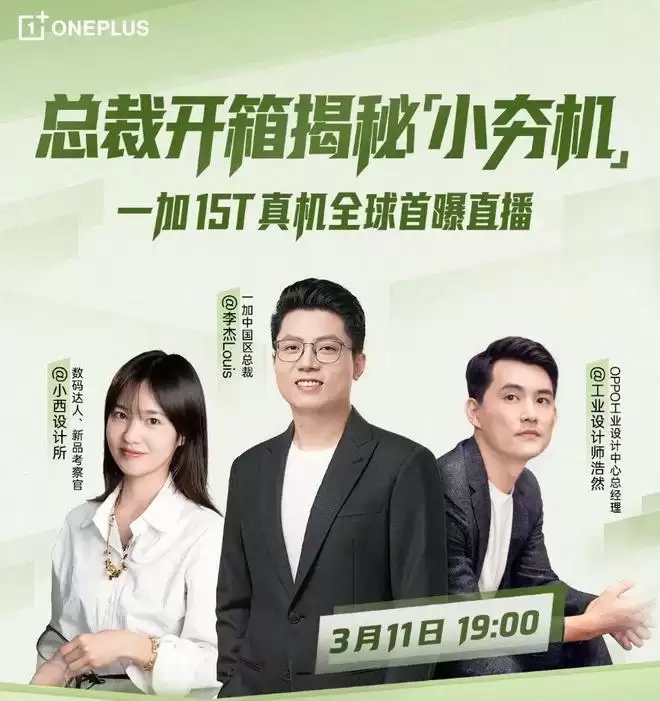 一加最新还表示,将在 3 月 11 日 19 点举行一加 15T 真机全球首曝直播。