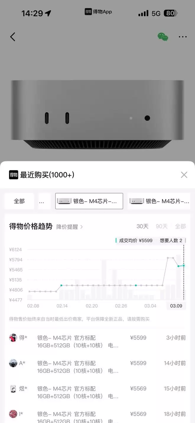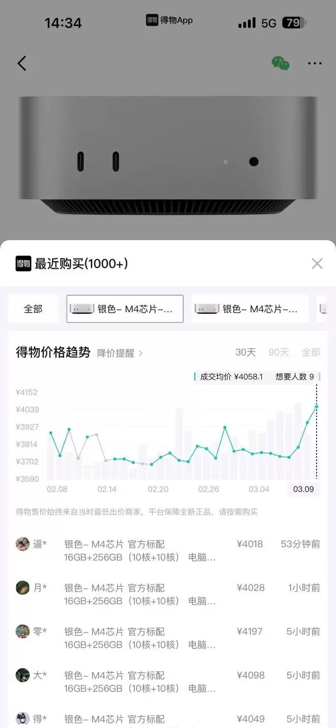 得物App数据显示,Mac Mini M4主机多个型号已在得物App上售罄,最近一周Mac mini M4价格最高增长649元(13%)。