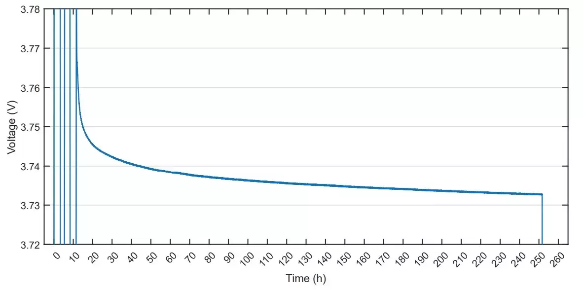 电压数据呈现出有意思的规律:电芯在前10秒电压下降60mV,第1小时内下降103mV——这主要是充电后的电压弛豫现象,并非真正的自放电。从第10小时到第240小时,电压仅额外下降12mV(从3745mV降至3733mV),表明电芯已基本趋于稳定。