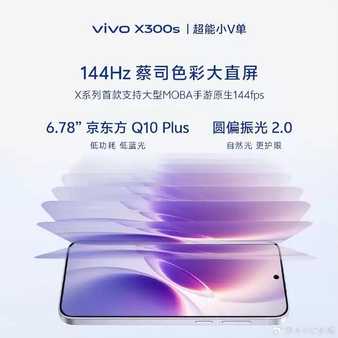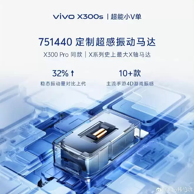 确定命名后,产品经理还详解了vivo X300s的三大升级亮点。首先是屏幕素质的全面提升——这次采用了144Hz蔡司色彩大直屏,成为X系列首款搭载144Hz高刷新率的机型,也是首款支持大型MOBA手游原生144帧率的设备。这块来自京东方的屏幕采用Q10+材质,尺寸达到6.78英寸,同时支持圆偏振片2.0等护眼技术。其次是升级为1511对称式双扬声器,这款与iQOO 15同规格的对称双扬,关键升级在于新一代功放和算法,用户在iQOO 15上体验到的超感游戏音域,在vivo X300s上同样能完美呈现。第三是定制了751440超感振动马达,这颗马达在性能上超越0816,振动量与1016相当,频宽更是传统9595的2.2倍,成为X系列有史以来最强大的振动马达。正因如此,官方将vivo X300s称为毫不妥协的"超能V单"。