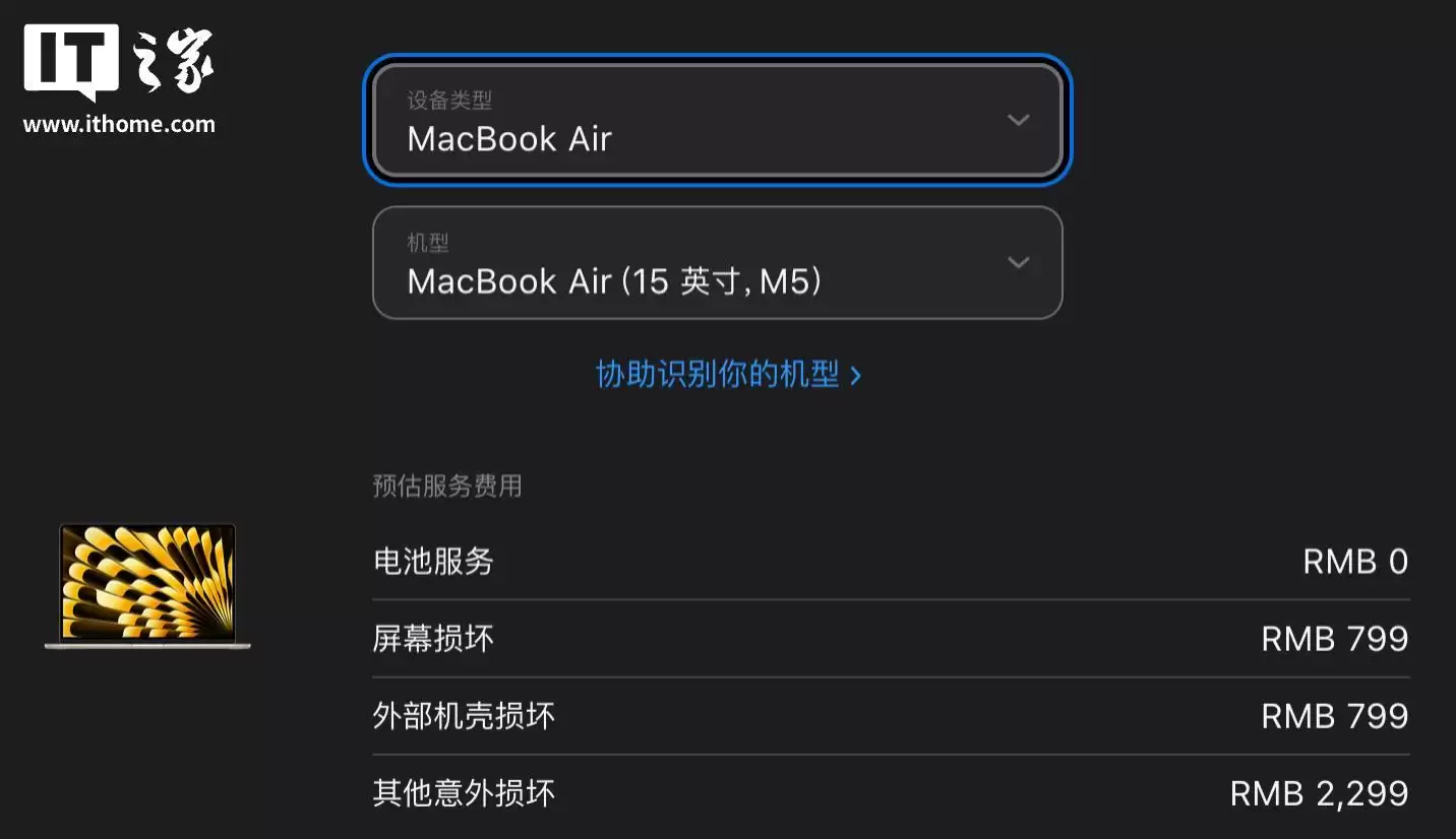 作为对比,MacBook Air / Pro M5机型的相关费用则高出不少。其屏幕损坏维修费为799元,外壳损坏维修费同样为799元,其他意外损坏维修费用高达2299元。在保外维修方面,MacBook Air电池更换价格为1418元,Pro机型则为1798元。