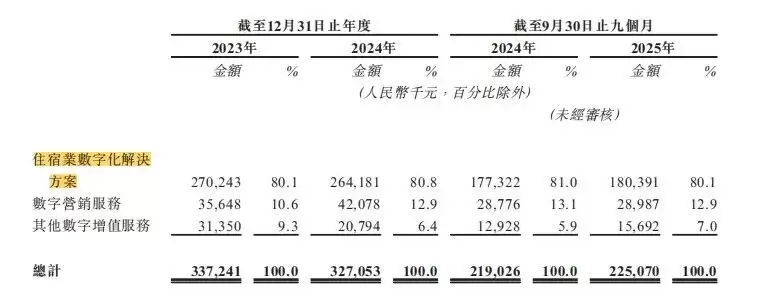 再看收入结构。其核心业务“住宿业数字化解决方案”,在申请新三板时的收入为1.39亿元,占总收入的41.2%。而到了申请港股时,这一业务的收入从1.39亿元变为2.7亿元,不止翻了一番。占总体收入的比重也从41.2%飙升到80.1%。