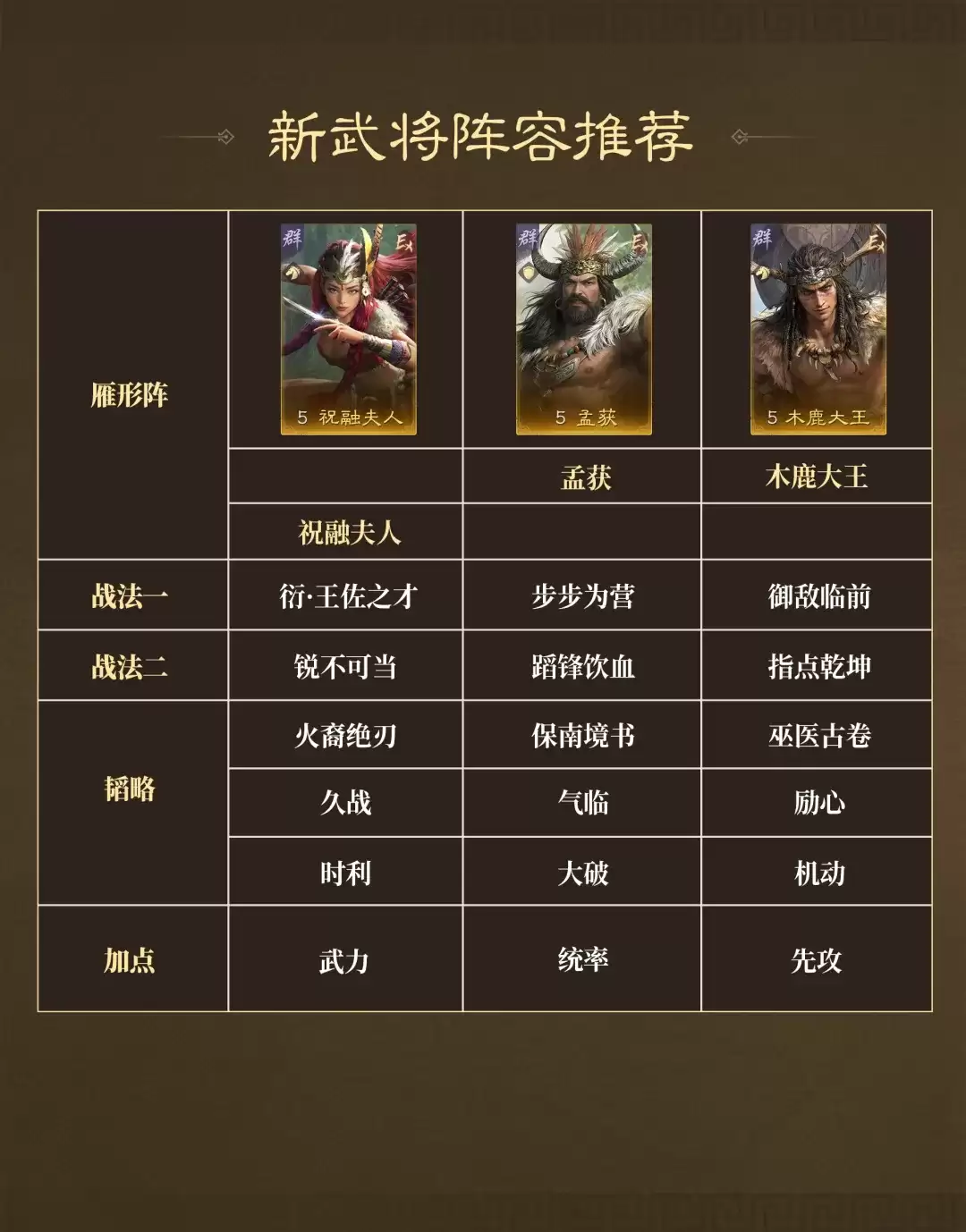 其缘分门槛较低,仅需2人即可激活;若3名异族武将同时上阵,全队可获得18%常驻减伤。推荐采用全先攻加点+雁形阵配置,确保首回合优先出手,快速削弱敌方核心属性。配合孟获“借刀”机制,可进一步放大压制收益;再衔接祝融的兵刃爆发与貂蝉巫医的持续治疗,整套体系兼具压制、续航与反制能力,对当前主流兵刃快攻阵容具有显著压制力。