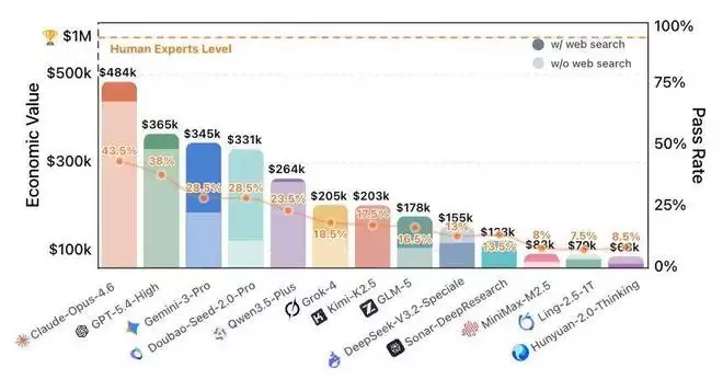 据此,把所有任务的经济价值加和计算后,超过了 100 万美元。如果在现实世界里把这些工作交给资深专家团队完成,你需要支付的成本就是百万美元量级。这样一来,模型评测不再停留在分数上,而是更直观地回答:AI 现在到底能稳定交付多少 “可兑现价值”,以及距离真正上岗还差什么