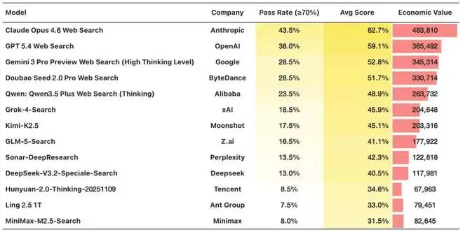 而从通过率的视角来看,即使是排名第一的 Claude Opus 4.6 Web Search,也骤降到43.5%,即只有不到 45% 的任务可以通过验收,第二梯队多在 25~30% 区间徘徊。换句话说,平均分看起来 “能用”,但能在一半以上任务里稳定达到可交付标准的模型,目前还不存在。