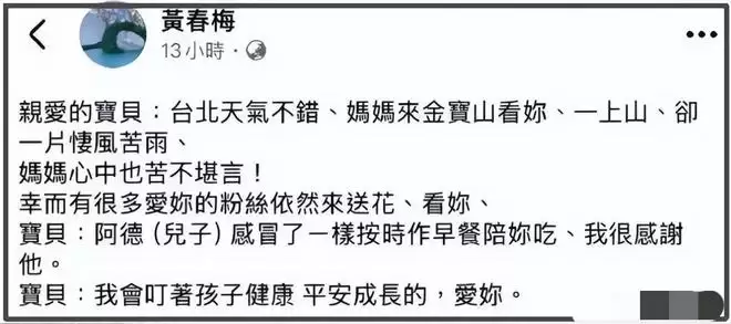 S妈还发了小作文,她说台北天气不错,妈妈来金宝山看你,一上山却是一片惨风苦雨,妈妈心中苦不堪言。