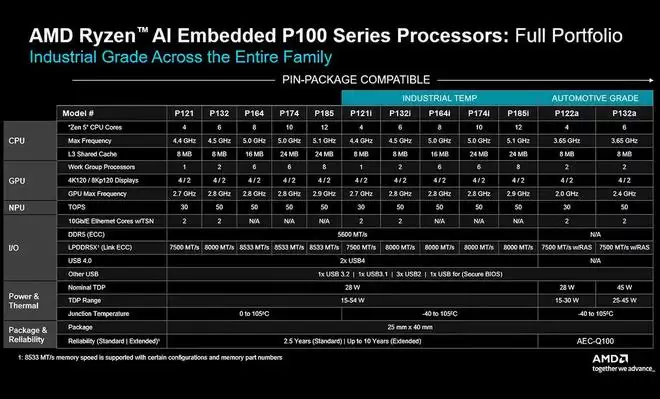 锐龙AI嵌入式P100系列涵盖标准版、工业级与车规级三大分支,各自具备不同的耐温范围与可靠性等级。该系列最高支持8533MT/s的LPDDR5X内存,其NPU算力最高可达50 TOPS。