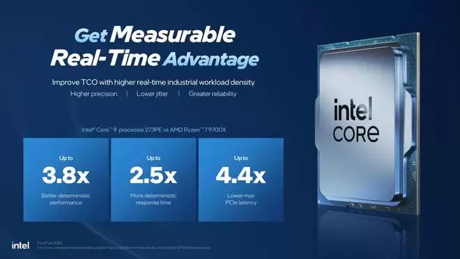 英特尔表示,第二代酷睿性能核“Bartlett Lake 12P”在最大PCIe延迟、确定性响应时间以及确定性性能表现上,均优于AMD的锐龙7 9700X,能够为现代化工业工作负载提供所需的强劲性能支持。
