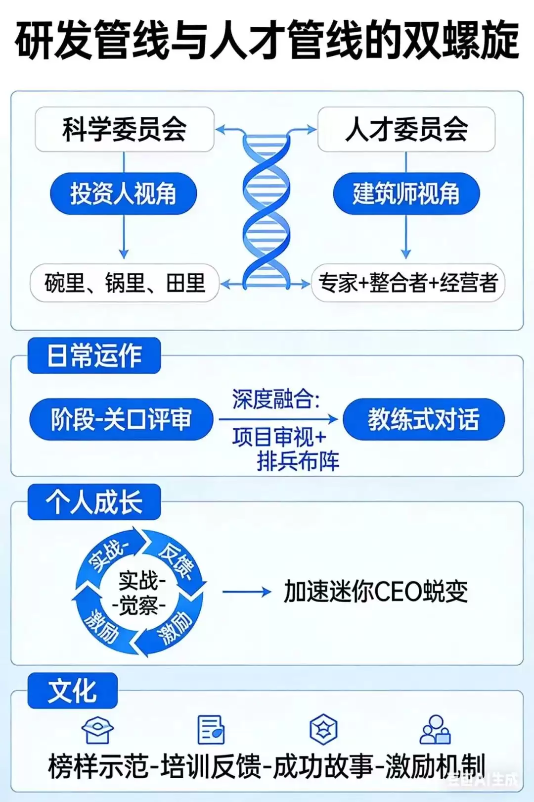 传统管理模式在此显得力不从心。倘若只注重研发管线,企业便如同涸泽而渔的“项目工厂”,终将面临人才枯竭;如果仅强调人才发展,又容易沦为脱离实战的“精英俱乐部”,难以驱动真正的突破。问题的核心在于,不能将“人”与“事”简单视为支持关系,而应视之为休戚与共的命运共同体。
