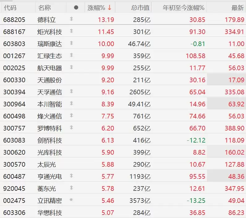 3月10日,A股市场中CPO概念股表现强势,集体走强。其中,德科立涨幅超过13%,炬光科技涨超11%,瑞斯康达、汇绿生态、航天电器的股价均触及10CM涨停。天通股份、天孚通信的涨幅超过9%,本川智能涨超8%,烽火通信涨超7%,罗博特科和剑桥科技涨幅都超过6%。光库科技、太辰光、亨通光电、剑桥科技、立讯精密和华翊科技也均有不俗表现,涨幅均超过5%。