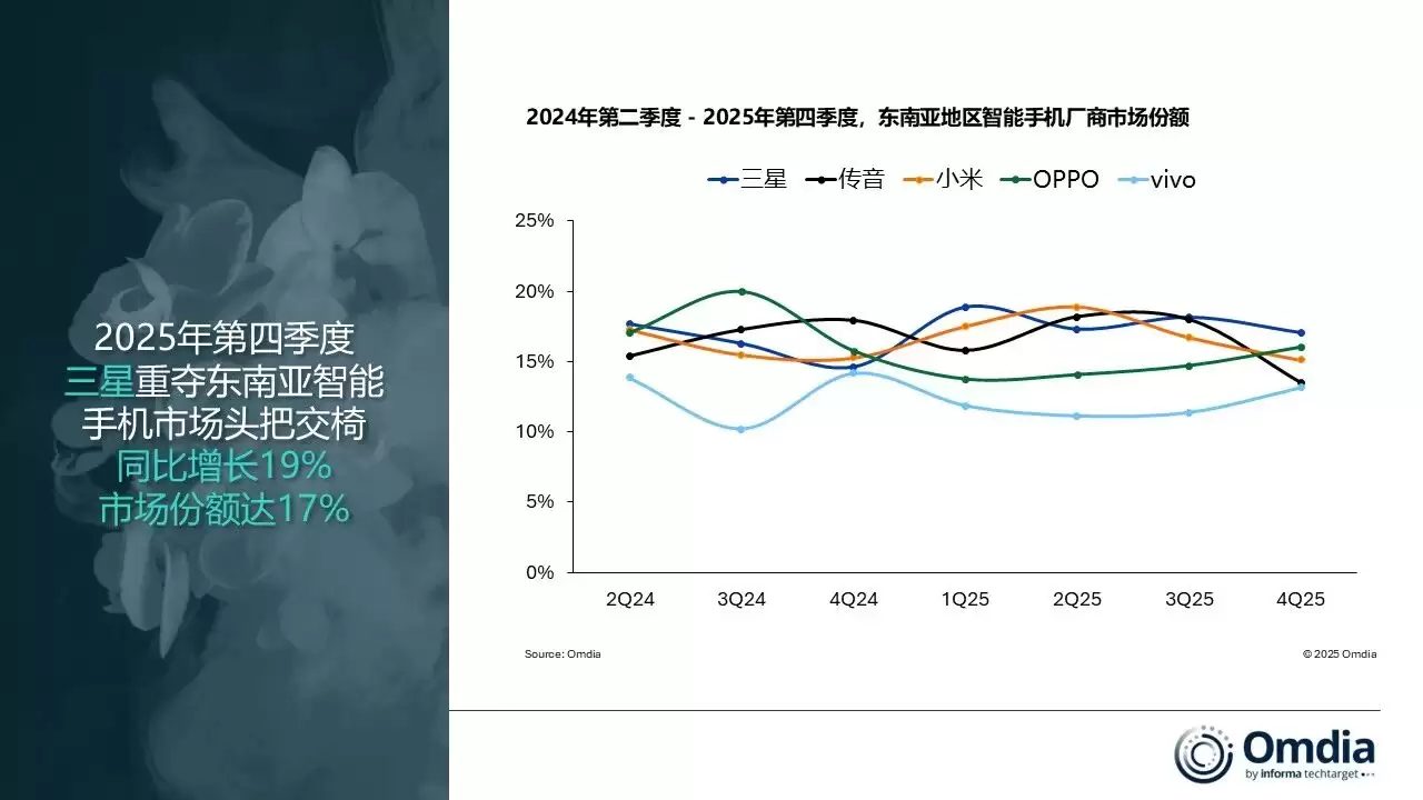 2025东南亚手机市场:三星稳居榜首,小米份额升至17%