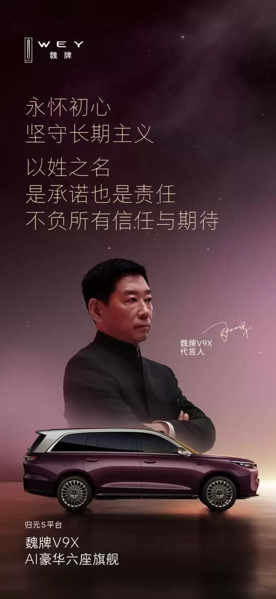 直播中,魏建军用三个“第一”概括了自己的造车理念:第一个以姓氏命名品牌、第一个亲自为车型代言、第一个将中国元素具象化融入车型设计。这种以个人声誉为品质担保、以姓氏押注品牌发展的做法,不仅展现了魏建军对魏牌的信心,更体现了中国汽车人从“制造”向“创造”转型的决心。魏牌V9X的LOGO设计灵感源自保定直隶总督署门前的大旗杆,寓意标杆、方向与独立,象征着中国豪华品牌“守初心、不依附、不盲从”的精神内核。