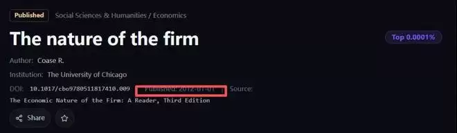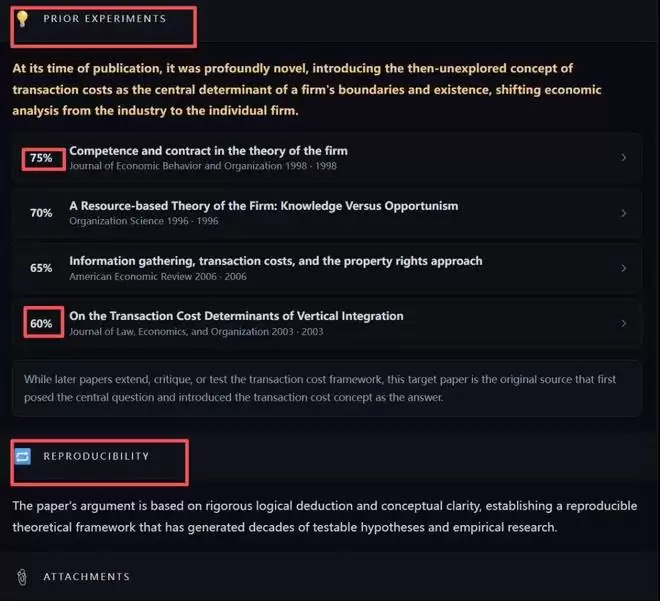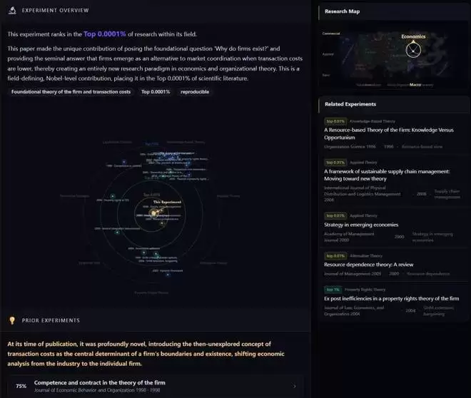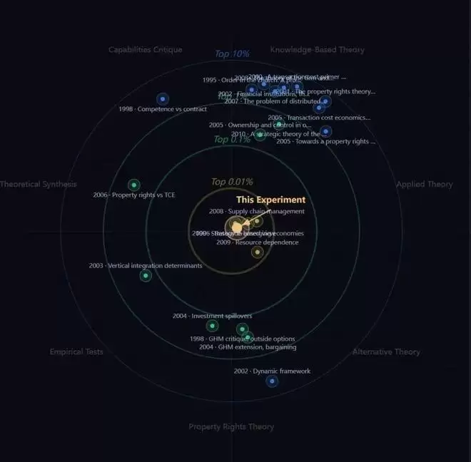 比如,系统会识别出 《企业理论中的能力与合同》 与科斯框架有很高的相关度,属于典型的「嫡系演化」;而像 《纵向一体化的交易成本决定因素》 这类更偏具体商业行为分析的研究,相似度则会低一些。