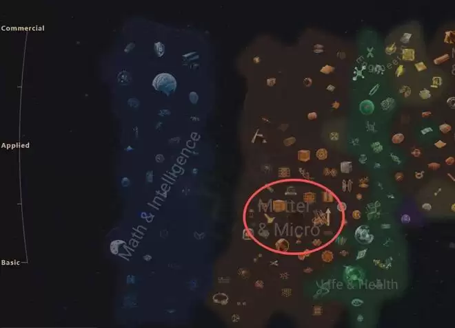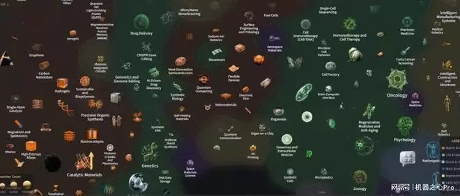 当某个区域里密密麻麻挤着大量小图标,通常意味着这个领域已经被拆出了很多细分方向。比如生命科学,里面会密集分布基因、蛋白质、细胞调控等不同子方向。这类领域通常已经非常成熟。