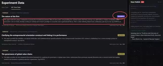 在 O-DataMap 中,返回的不是枯燥的文献列表,而是一条高度结构化的科研事件流(Experiment Data)。一个极罕见的紫色标签会瞬间击中你:Top 0.0001%。