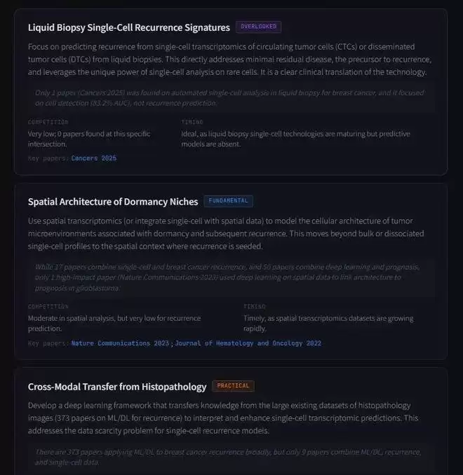 但 AI 进一步通过检索发现,在「单细胞+乳腺癌+复发随访」这个交叉点上,全球仅有 17 篇相关论文。
