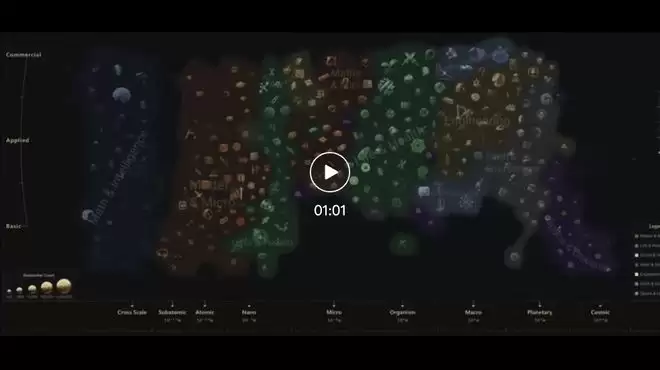 横轴,代表人类研究对象的尺度。从左到右依次是亚原子、原子、纳米,一直到生物、地球、宇宙。纯数学、AI 这样的领域,本身是为不同尺度问题提供方法和工具,则被放在了最左侧的 「Cross Scale」 区域。