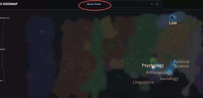 而哈佛大学心理学教授 Steven Pinker 点亮的区域更为分散,横跨心理学、语言学与认知科学等领域。不同区域的亮度虽有差异(影响力不同),却足以映射出他作为跨学科知识分子的研究广度。