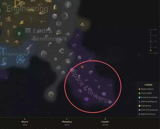 相反,有些区域明显稀疏得多。比如 Space & Universe(宇宙科学),在地图上看起来就更像一片「无人区」。