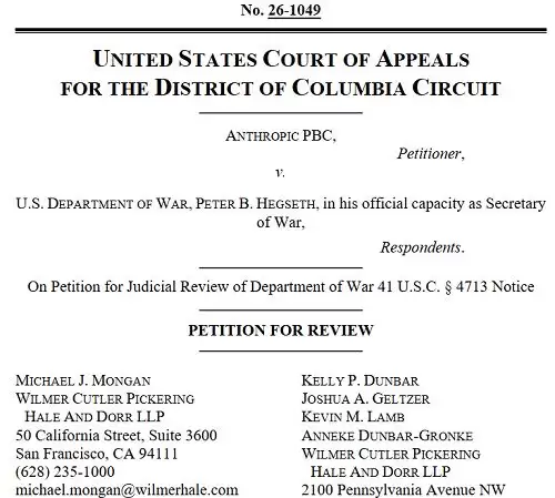 除了上述诉讼外,Anthropic还在美国哥伦比亚特区联邦巡回上诉法院针对美国战争部提起另一则诉讼,同样要求撤销美国战争部的决定,认为该决定存在违宪、程序违法、依据不足等问题。