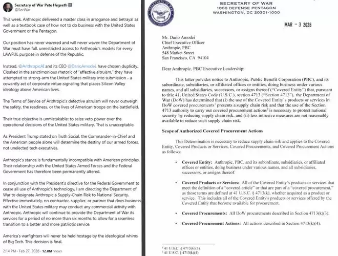 美国战争部长也发布公开指令,指示战争部将Anthropic认定为“国家安全供应链风险”。美东时间3月4日,战争部向Anthropic发送正式通知,称其已认定Anthropic的产品或服务存在供应链风险,需要限制对Anthropic的采购。
