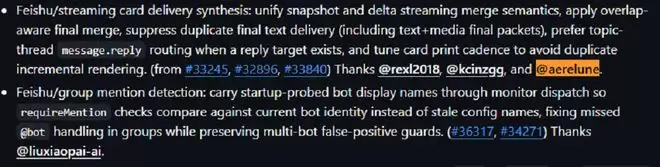 中国开发者也贡献了不少更新。OpenClaw在国内常常与飞书一起搭配使用,但在与飞书生态的结合上还做得不是很好。国内开发者@liuxiaopai-ai、@rexl2018、@kcinzgg和@aerelune等就提交多个更新,优化了OpenClaw在飞书内部进行命令识别、消息交互、身份识别优化时的效果。