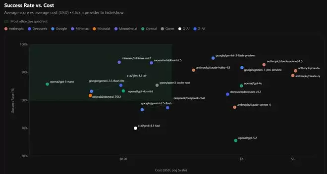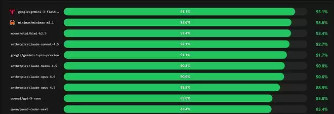 在正确率榜单的前10名中,来自谷歌的Gemini 3 Flash Preview拿下第一,而MiniMax M2.1和Kimi K2.5分列第二、第三,接下来是来自谷歌、OpenAI和Anthropic的多款模型,阿里的Qwen3 Coder Next位列第十。