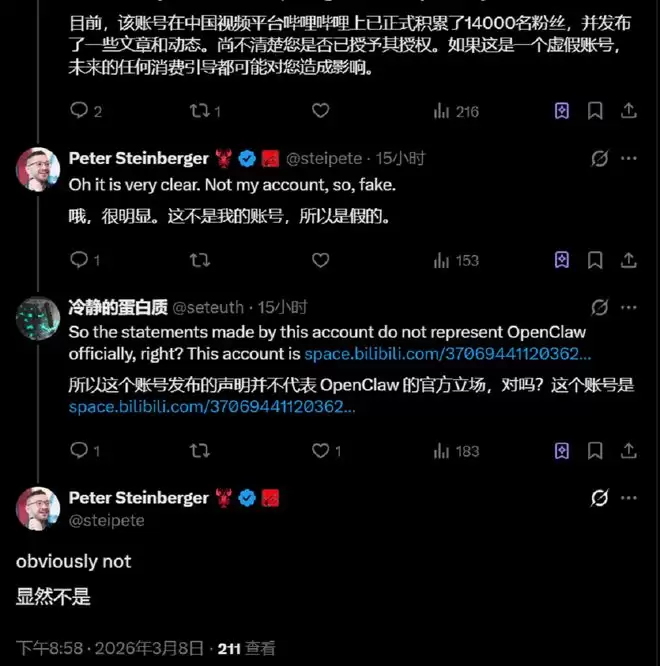 OpenClaw创始人Peter Steinberger昨天在X上亲自下场手撕国内社交平台上的“李鬼”账号,明确强调:OpenClaw目前在微博、B站没有任何最新号。