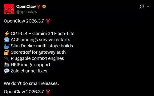 ▲OpenClaw2026.3.7更新(图源:X平台)