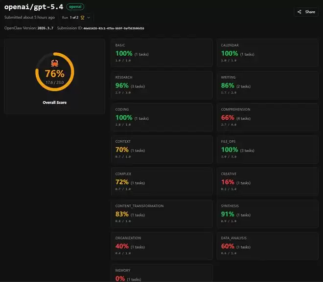 榜单上,还有几款新发布的模型意外地表现不佳。比如,OpenAI最新发布的GPT-5.4任务正确率仅有76%,在总榜上排名第20,甚至不如2024年发布的GPT-4o。