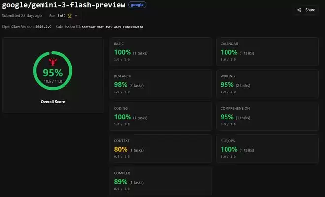 拿下准确率榜第一的Gemini 3 Flash Preview参加了11项任务的测试,满分11分,得分为10.5。在日历填写、编程和文件操作等任务中,Gemini 3 Flash Preview拿到了满分成绩,不过在理解、写作等任务中出现瑕疵,而在上下文记忆检索任务中其表现最差,得分仅为80%。