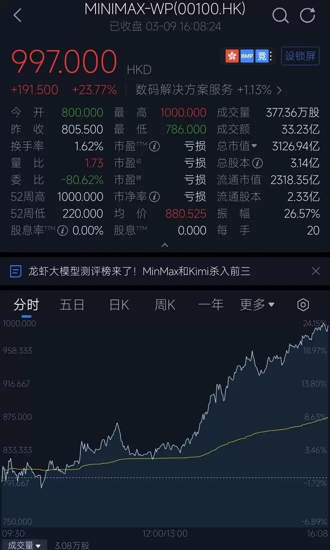 ▲MiniMax股价逼近1000港元(图源:腾讯自选股)