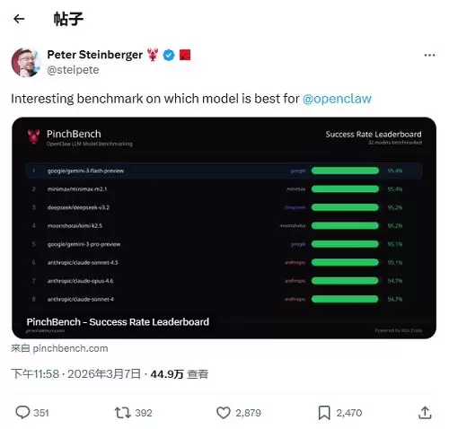OpenClaw创始人Peter Steinberger还在3月7日顺势转发了专用于评估大模型在OpenClaw智能体任务中表现的基准测试PinchBench,从32款模型评出最新养龙虾大模型排行榜。