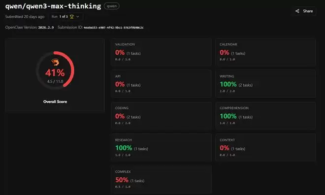 Qwen3 Max Thinking的任务正确率仅有46%,在部分涉及文件操作、脚本撰写的任务上未能成功执行,拿了零分。