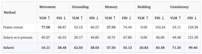 我们的方法在视觉效果和所有评估类别的定量指标上均表现更优。在基于运动轨迹的动作执行方面,所有架构变体均表现强劲,并在对应类别的 VLM 评估中获得高分(见表)。但在涉及建筑、场景一致性和玩家视觉对齐等困难场景时,我们的方法展现出了卓越的性能,这体现在这些类别中更高的 VLM 评分上。尽管「帧拼接法」在我们的「移动(Movement)」评估中表现更好,但定性分析发现,该方法在面临「无操作(no-op)」动作时会出现动作幻觉。
