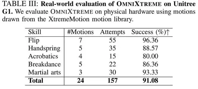 该框架让机器人能够通过一套统一策略完成包括后空翻、托马斯全旋、武术踢击等在内的多种高动态动作,并在真实机器人上实现了超过90%的成功率。