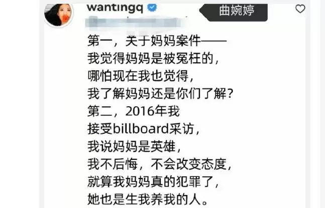 谁知曲婉婷不仅没有为此道歉,还一直为母亲喊冤。