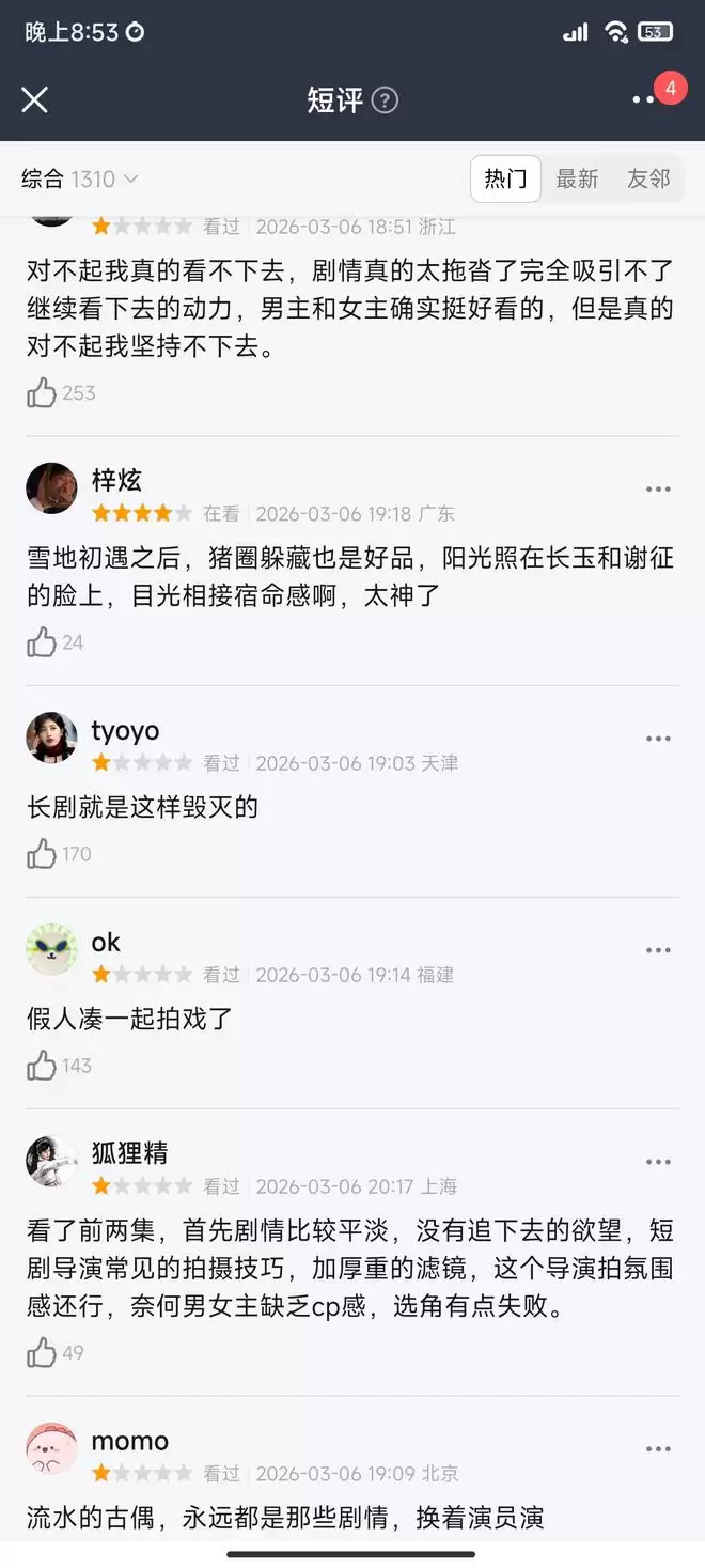 观众评价一针见血,人都很好看,但是磨皮过重,弱化了演员表情细节,显得太精致太假了。场景都毫无使用痕迹,雪那么大还开窗,张凌赫还穿那么单薄,路上的行人也穿得单薄,丝毫没感觉到寒冷,像在拍MV。