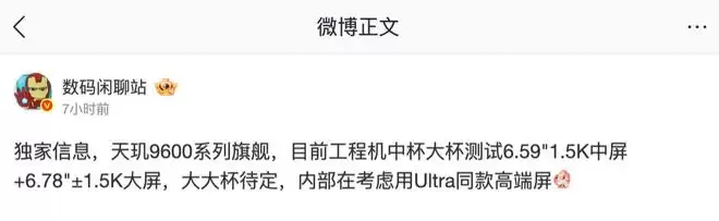 这位博主进一步透露,目前该机型的中杯与大杯版本正在测试两种规格的屏幕:一款是6.59英寸的1.5K中屏,另一款则是6.79英寸的1.5K大屏。而备受期待的超大杯版本,内部也在积极评估采用与Ultra型号同款的高端显示面板。