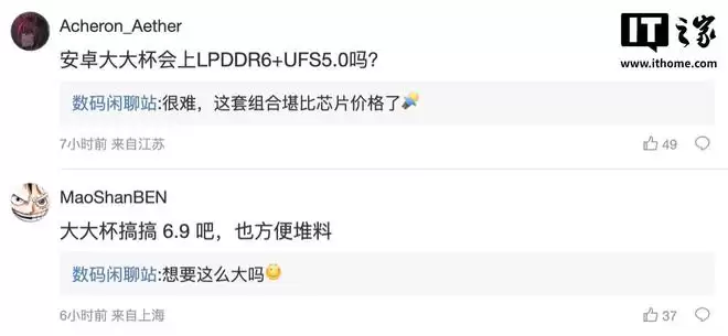 随后,有网友在评论区提问:“安卓超大杯会上LPDDR6和UFS5.0吗?”博主回复称:“难度不小,这套组合的成本都快赶上一颗芯片了。”另一位用户则建议:“超大杯干脆做到6.9英寸吧,这样堆料也方便些。”对此,博主半开玩笑地回应道:“想要这么大的吗?”