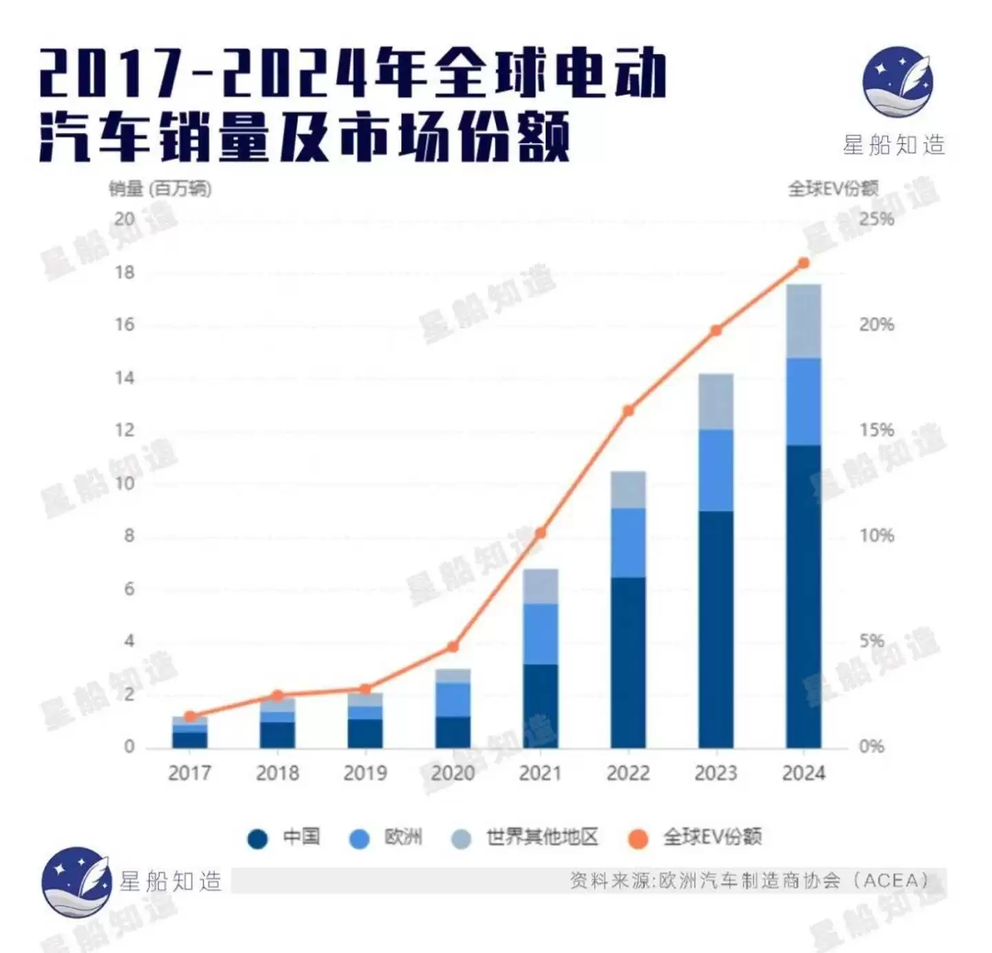 《星船知造》在欧洲汽车制造商协会(ACEA)最新统计看到,尽管有一系列政策强推,但2025年全年欧洲新车注册中,纯电动车(BEV)的市场份额仅维持在17.4%,远未达到欧盟激进路线图所设想的“爆发点”。见下图