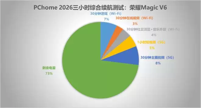 7150mAh大容量电池带来的续航提升立竿见影,3小时实测后剩余电量73%,相较于前代的69%剩余电量,多保留了4%的电量。看似微小的差距,带来的体验感知却十分明显,剩余70%以上电量时,会让人觉得手机仍处于健康电量范围;而电量跌至60%区间,便会让人开始顾虑剩余使用时长。从各子项测试数据来看,游戏、视频播放等场景的耗电量大幅降低,这一省电表现也离不开荣耀都江堰电源管理系统。该系统搭载的AI算法,可根据识别到的精准环境数据与使用场景,动态调整充放电策略,为手机提供适配的性能与电量输出,从而实现更高效的省电效果。