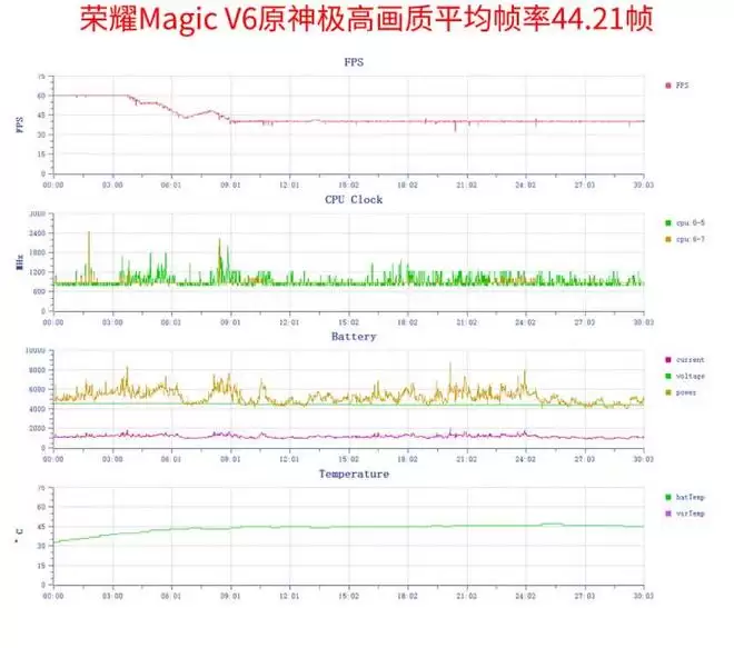 相较于其他大折叠手机,荣耀Magic V6拥有满血性能加持,实测大屏运行《原神》极高画质跑图+打怪,30分钟平均帧率达44.21帧。从帧率曲线来看,游戏初期可满帧运行,4分钟时开始出现轻微帧率波动,9分钟后稳定在40帧。需要注意的是,使用大屏玩游戏,负载远高于外屏,荣耀采用“保稳定性”的优化策略,确保游戏全程运行流畅。功耗方面,实测平均功耗5.2W,机身正背面最高温度分别为45.2℃、44.5℃,温控表现出色。