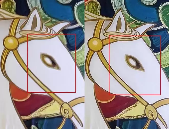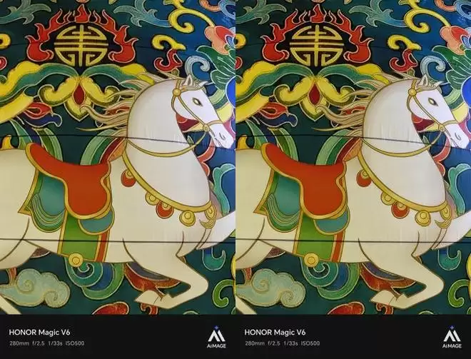 高倍变焦时,AI算法介入难以避免,而荣耀Magic V6的解决方案十分贴心。在所有使用AI超清算法拍摄的照片中,荣耀会同时保留原始照片与AI处理后的照片,用户可根据喜好选择使用。样张对比效果十分明显,放大后可见,左侧原图中马的眼睛部分明显模糊,右侧AI优化后的照片则进行了精准修正,成像清晰锐利。