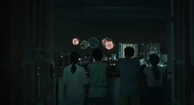 《我们不是陌生人》的海报,是主人公一家在阳台上看烟花的场景,新加坡独立60周年的夜晚,平民百姓在自己家远眺城市中的庆祝。这一幕,是陈哲艺想要呈现的新加坡社会底层生活的质地。“这个世界太惨了,我不希望在一部文艺片里,拍穷跟苦,都只是毫无期望的一片灰暗。”