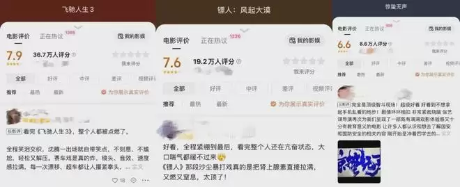 翻看三部影片在榜单下的高频评论,会发现无论是赛车狂飙的刺激、暗战交锋的窒息,还是大漠乱战的惨烈,观众的观影体验出奇地一致:“燃到爆炸”“看得人手心冒汗”“像坐过山车一样”,高度相似的评价清晰地指向头部影片共同的情绪内核——热血。