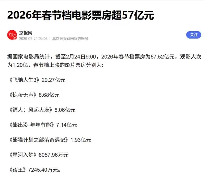 然而,纵向对比近五年诞生的单部电影动辄四五十亿票房神话的春节档,2026年春节档虽然依旧热闹,但也并没有出现真正意义上断层领先的“绝对头部”。据国家电影局统计,截至2月24日9点,2026年春节档总票房为57.52亿元,其中《飞驰人生3》票房为29.27亿元、《惊蛰无声》票房为8.68亿元、《镖人:风起大漠》票房为8.06亿元,票房前三名的作品票房叠加都不到50亿元。