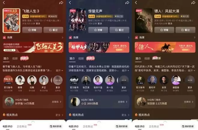在抖音影视排行榜上,《飞驰人生3》《惊蛰无声》与《镖人》的热度已连续多日位列前茅,赛车喜剧、国安谍战、硬核武打,三部风格迥异的作品成了今年春节档当之无愧的话题中心和票房引擎。